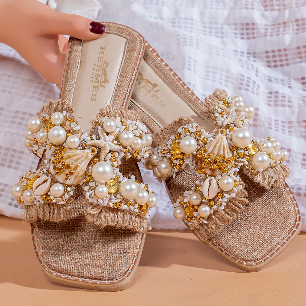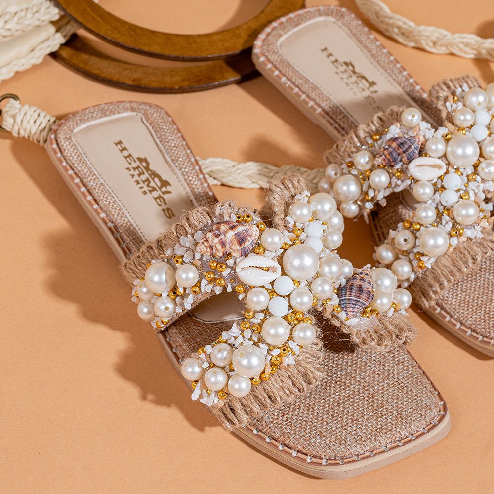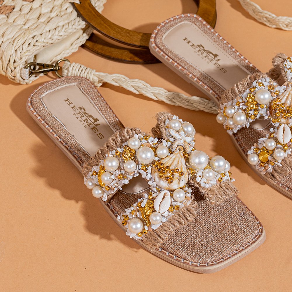 استمتعي بإطلالة صيفية ناعمة وراقية مع سليبر نسائي بتصميم مستوحى من HERMES، مصنوع يدويًا من خيش طبيعي ناعم، ومزين بتفاصيل فاخرة من الصدف واللؤلؤ تضيف لمسة أنثوية فريدة.