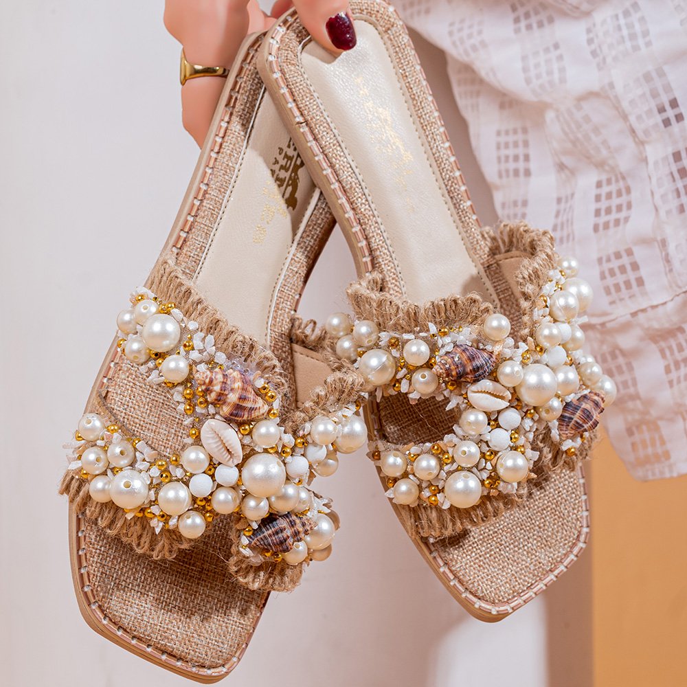سليبر صيفي راقٍ من خيش طبيعي بلمسة صدف ولؤلؤ، خفيف ومريح جدًا للمصايف والخروجات، مع شحن سريع ومعاينة قبل الدفع.
